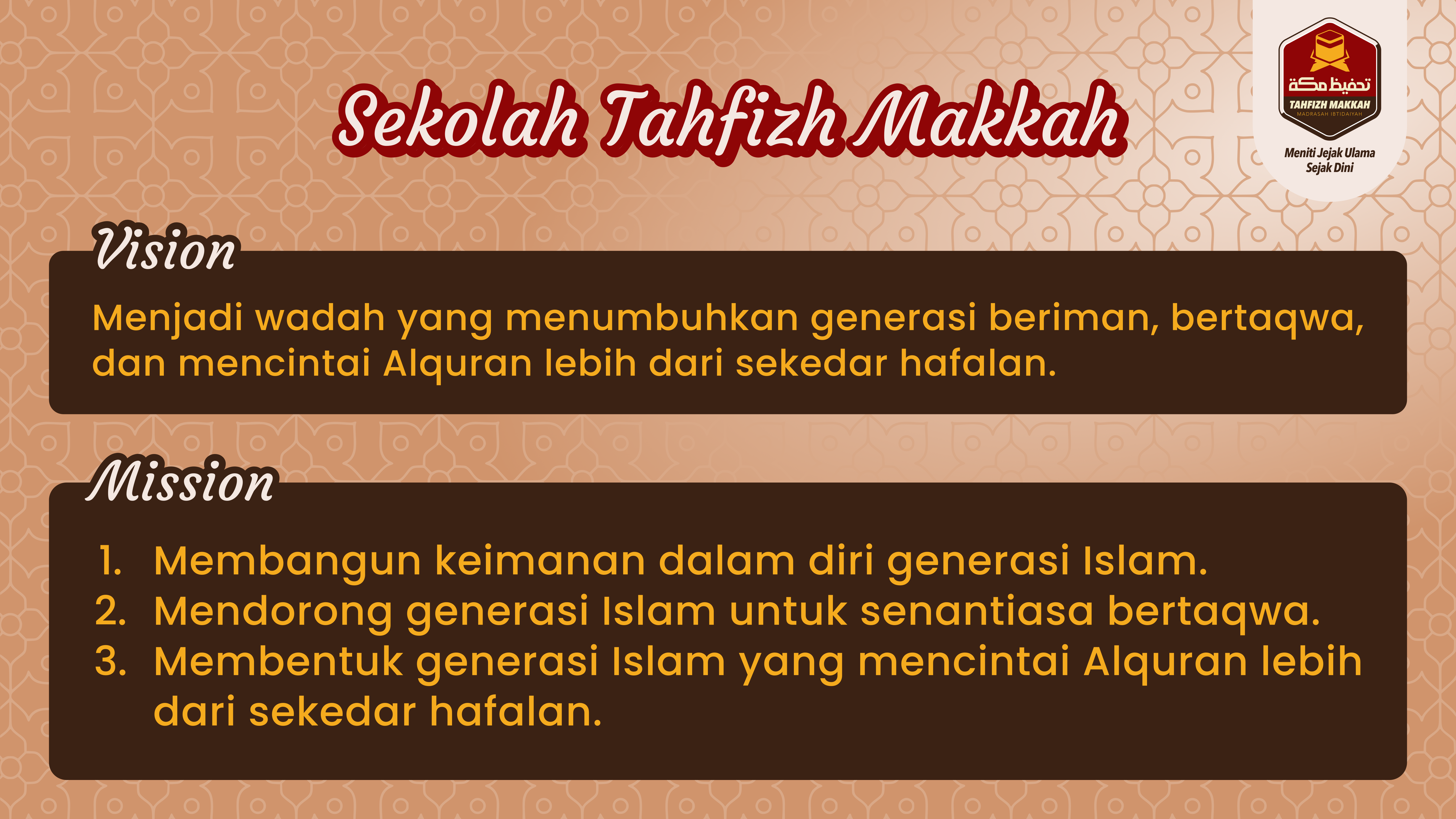 Tahfizh Makkah School aims to build the people by educating children from an early age to become a Rabbani generation through providing them with Alquran and hadith so that they can have the ability to read, memorize and recite them melodiously and can lo